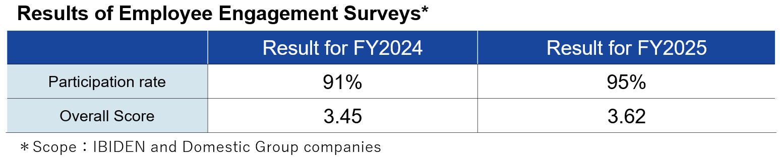 Our company and its Group companies in Japan have conducted a survey since FY2007 once every two years, intended to understand and analyze changes in employee sentiment, HR issues and problems through regular observation and to propose and implement solutions for improvement. Since FY2023, we have conducted an annual survey on engagement, including a sense of fulfillment, a sense of purpose, and a sense of belonging, in order to carefully monitor changes in their sentiment over time and reflect them in HR policies in a more timely manner. In FY2025, 95% of our employees participated (target*: 4,077 people; respondents: 3,862 people). The overall score has improved to 3.62 (from 3.45 in the previous year), and we aim to increase it to 3.7 by 2027. Based on the survey results, we are reviewing the evaluation system, strengthening measures to stimulate workplace communication, and increasing the profile of new employee benefit services.