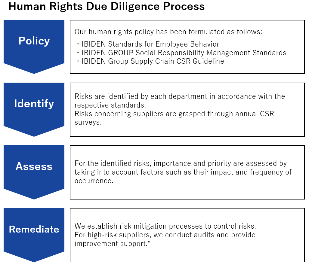 After preparing the "IBIDEN GROUP Social Responsibility Management Standards," we summarized the mechanism to respond to human rights issues and matters to be noted as a supervisor. Supervisors periodically check the impact of our social responsibilities on workplaces and their risks from the perspective of the Management Standard, including human rights issues. The management standards include checking procedures intended to avoid forced labor and child labor, which are incorporated into the procedure manual of each relevant division. For example, the Management Standards include the Rules to Prohibit the Storage of Private Documents, which are intended to prevent forced labor, and stipulate a minimum age checking procedure, which are intended to prevent child labor.