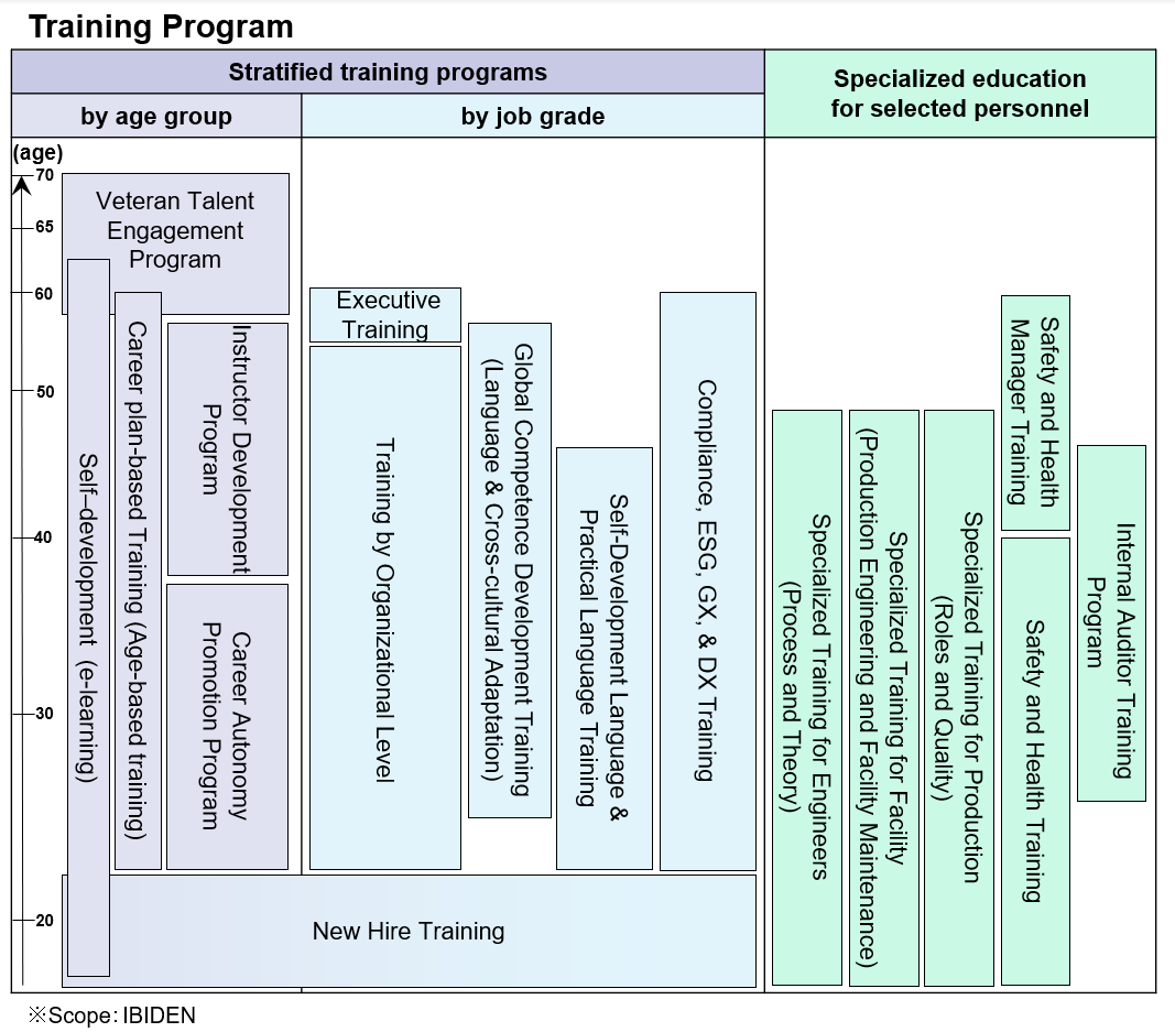 We are making an effort to nurture employees who can contribute to strengthening the company's global competitiveness and those who are capable of cross-cultural management. In particular, in order to help employees accept different values and improve their communication skills with overseas staff, after selecting candidates for overseas assignments, we have implemented programs, such as cross-cultural training and practical language training since FY2024. Additionally, we provide e-learning training to improve the management skills of IBIDEN employees who will be appointed as executives of overseas Group companies, and more than 20 employees have taken the training so far.