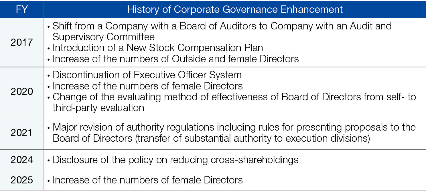 The Group considers corporate governance to be a key management mechanism for transparent, fair, prompt and resolute decision-making, and all Group companies are thus actively committed to improving corporate governance. As part of our Group's corporate governance, we are enhancing internal control by proactively undertaking activities to advance risk management and compliance. Furthermore, we are enhancing and strengthening the management oversight functions of the Board of Directors and the audit functions of our Audit and Supervisory Committee. These steps will enable us to construct a transparent corporate governance system worthy of the trust of shareholders and other stakeholders and fulfill our corporate social responsibilities, and will help us improve our corporate value through sustained growth.