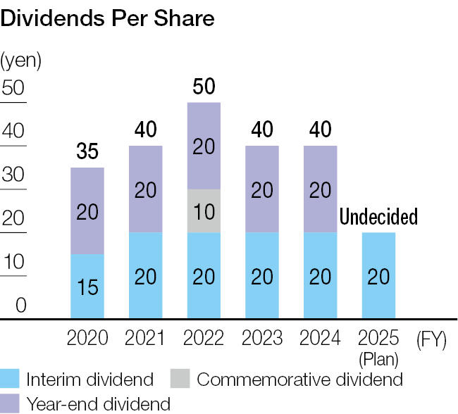 With regard to shareholder returns, our basic policy is to maintain stable dividends and determine payouts comprehensively based on profit levels, financial targets, and share price. Regarding our approach to capital allocation, we have recently prioritized capital investment for IC package substrate facilities to drive business expansion. Although ongoing growth investment remains necessary, we will provide shareholder returns from the aspects of both stable dividends and dividends aligned with profit, aiming to further increase shareholder value. For FY2024, the annual dividend per share will be ¥40, equal to that of FY2023, including the interim dividend of ¥20 per share paid in November 2024.