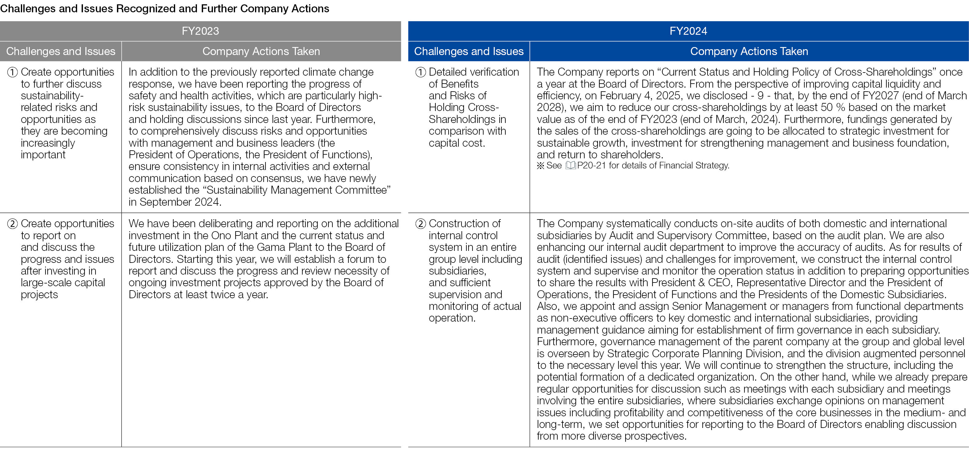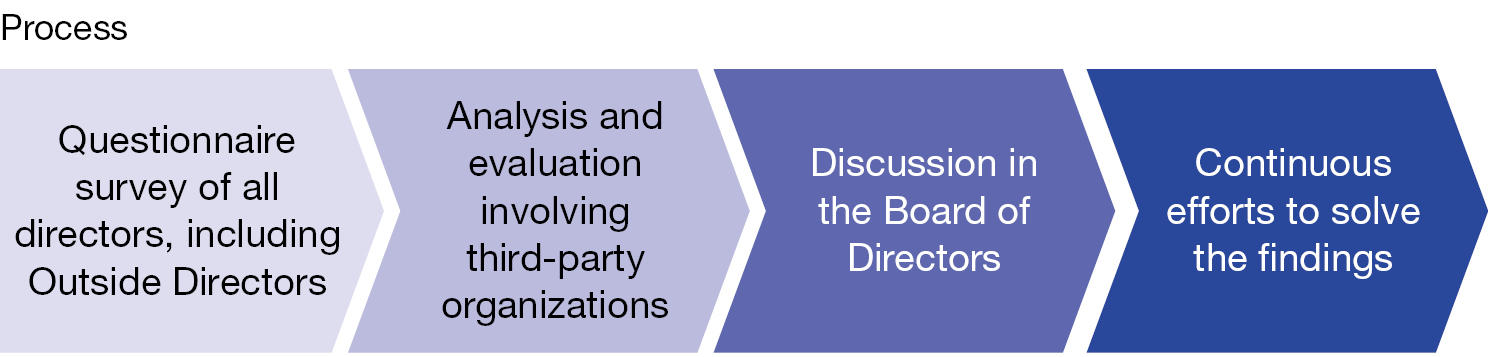 The Company conducts annual analysis and evaluation on the effectiveness of the Board of Directors, in order to improve the function of the Board of Directors as a whole, through a continuous process of reviewing whether the Board of Directors is functioning effectively as a whole and taking appropriate measures such as rectifying problems and enhancing strengths based on the result of such review. We discuss the results at the Board of Directors meetings and disclose the summary thereof.