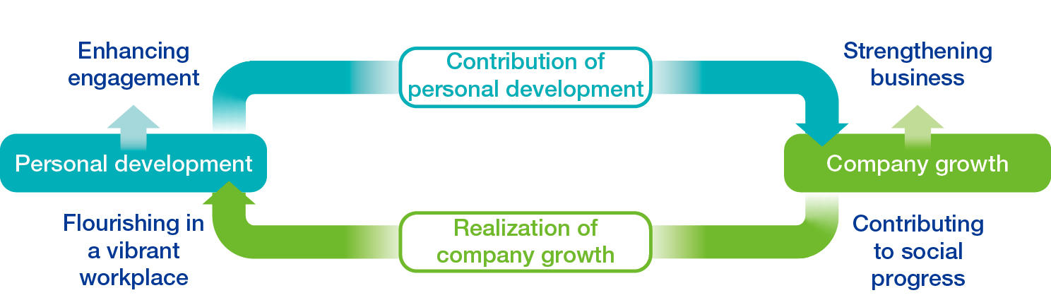"Self-sustained human resources" refers to human resources who take ownership, proactively determine what needs to be done, and act with agility. At the Company, we are nurturing human resources so that each employee can experience both personal growth and the growth of the Company, enabling them to act independently to create and strengthen competitiveness. In addition to an education framework for enhancing knowledge and skills, we are establishing a development environment that promotes individual autonomy by clarifying career plans through career interviews and similar initiatives. Furthermore, by managing the organization so that individual achievements translate into organizational results, we aim to create an environment in which employees can work with a sense of purpose and vitality, thereby strengthening the business.