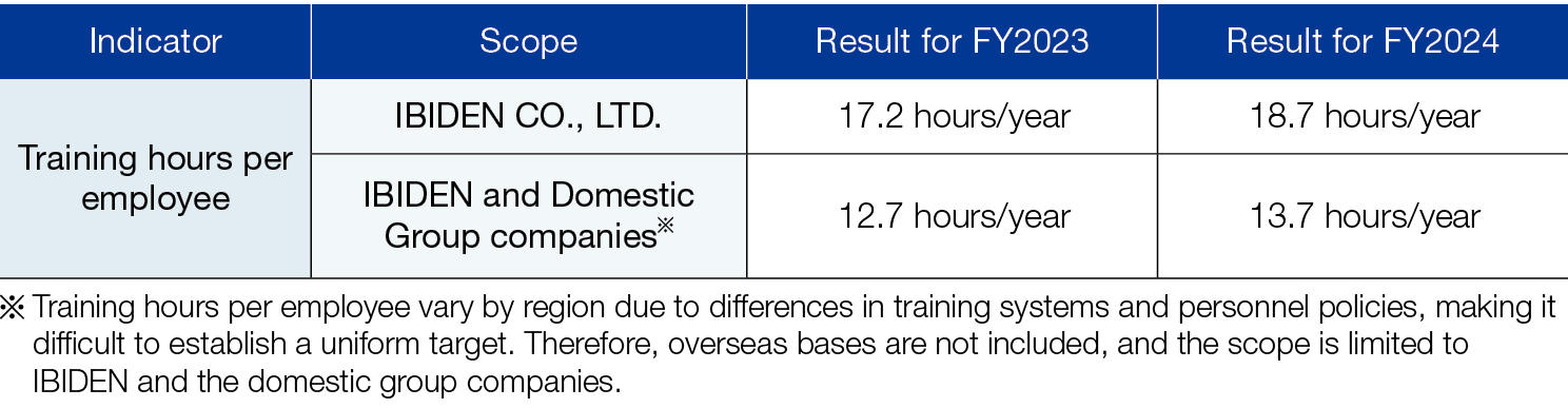 As an indicator for human resource development, we have set an interim target for training time of 21 hours per employee per year by FY2027 (IBIDEN Co., Ltd.).